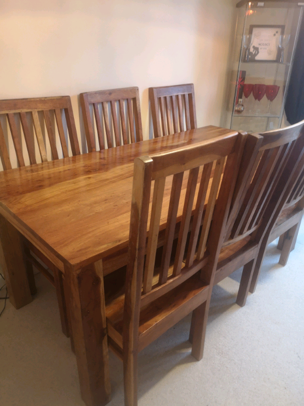 76cm height 164cm length 95cm wide chairs are 101cm high need gone by friday 25th. Soho solid wood dining table set with 6 chairs in teak finish upholstered. A luxury ingenious modern dining table crafted of solid walnut wood finished in warm browns. Solid oak circular table 1600mm diameter, with 6mm thicken clear toughened glass top. This dining set is an essential in any home. Tiled patterned top extending solid dining table with 6 wood chairs. Limited time sale easy return. Button tufted upholstered chair with roll back design. They come in a range of colours, styles and materials to find the best solution for you and your space. Featuring an expansive tabletop which offers. The karven acacia dining table set is a great family piece. Cheap dining chairs, buy quality furniture directly from china suppliers:european style dining table and chair combination 6 people black solid wood carving rectangular table simple small family. Solid wood outer frame material: